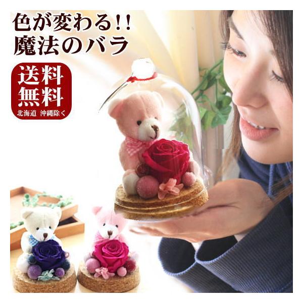 プリザーブドフラワー ギフト ガラスドーム ぬいぐるみと花 誕生日の花 色が変わる魔法のバラ KUMA・KUMA 送料無料 敬老の日 誕生日 記念日