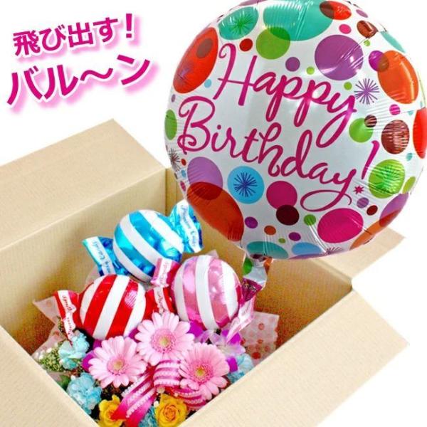 箱を開けるとバルーンが飛び出す楽しいバルーンフラワー。 誕生日、ご結婚、記念日、ご用途に合わせてお好きなバルーンをお選び下さい! ■商品形態:飛び出すバルーン フラワー 生花アレンジメント ■使用花材:メイン:ガーベラ、その他 ■花材について:黄色のガーベラはひまわりに変更する事があります。 ■飛び出すバルーンの特徴、注意点 ●ヘリウムガス入りバルーンは低温ではしぼみ、暖かい所では膨らみます。 真夏や真冬など室内外の寒暖の差が激しい場合は、置く場所によって急激に膨らみ、破裂する恐れがあります。 破損事故を防ぐために、バルーンは少し圧力を下げてお送りいたしますので 何卒ご理解下さい。 到着後は、エアコン、直射日光などの影響がない場所でお楽しみ下さい。 ●ヘリウムガス入りフォイルバルーンの浮遊期間の目安は、 18インチ(丸・ハート・星)で7〜14日、 1ヶ月くらいかけてゆっくりとしぼんでいく、とお考え下さい。 ◎季節や場所など環境によって、 ガスの抜けるスピードが異なります。 バルーンフラワー ギフト あすつく 送料無料 翌日配達