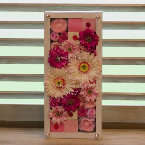 ■商品用途 結婚式のウェルカムボード・お祝いのフラワーギフトなど 還暦・誕生日・結婚祝いに ■枠の色 枠の色も3色からお選びいただけます【白枠・黒枠・茶枠】 ■商品セット内容 ピンクかオレンジでお選びくださいオーダーも可能です プリザーブドフラワー4輪 造花 ガーベラ 木箱・アクリル・文字入れ ■商品サイズ 木製フレーム 高さ400mm 横幅180mm 厚み55mm アクリルフレームまでの厚み73mm 飾り玉まで85mm アクリル3mm厚 400mm×180mm ■アクリルへの文字入れ 英文書体と和文書体の2種類からお選びください 文字色は白文字(無料)かゴールド文字(別途¥500) かをお選びください。文字数は英文50文字和文30文字以内は無料です(追加一文字50円) ウェディング、お祝い、開店祝い、母の日、お見舞い、出産祝い、お誕生日お祝い、バレンタイン、ホワイトデイ、敬老の日、ハロウィン、父の日、クリスマス、お正月、還暦、結婚