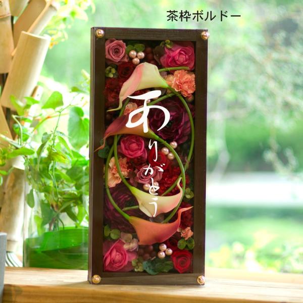 ボルドーとグリーンの2色より ■商品用途 結婚式のウェルカムボード・お祝いのフラワーギフトなど 還暦・誕生日・結婚祝いに ■商品セット内容 プリザーブドフラワー6輪 その他造花 木箱・アクリル・文字入れ ■商品サイズ 木製フレーム 高さ400mm 横幅180mm 厚み55mm アクリルフレームまでの厚み73mm 飾り玉まで85mm アクリル3mm厚 400mm×180mm ■枠の色選べます 枠の色も3色からお選びいただけます【白枠・黒枠・茶枠】 ■アクリルへの文字入れ 英文書体と和文書体の2種類からお選びください。 英文50文字和文30文字まで無料です(追加一文字50円) 文字色は白文字(無料)かゴールド文字(別途¥500税別) かをお選びください。 ウェディング、お祝い、開店祝い、母の日、お見舞い、出産祝い、お誕生日お祝い、バレンタイン、ホワイトデイ、敬老の日、ハロウィン、父の日、クリスマス、お正月、還暦、結婚