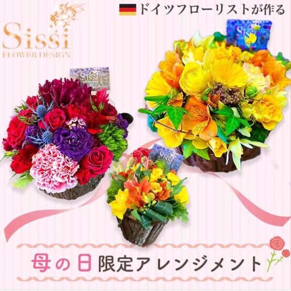 【ドイツ国家政府認定フローリストと国家検定フラワー装飾技能士1級資格を持った名店花屋で修行してきたプロのデザイナーが制作致します。】 母の日限定の本物木の皮を巻いたカゴに丸い形の構成するラウンドフラワーアレンジメントになります。(Sサイズ直径15cm程 )(Mサイズ直径20cm程)(Lサイズ直径25cm程) 女性に人気の丸いおしゃれなアレンジメントです。 [お届け期間につきまして] 【重要】現在母の日期間は【5/21〜5/24の期間のお届け】のどれかの日付にお届けになります。この時期は配送業者も大変混雑し遅延等も発送する場合もございます。皆様のご理解とご協力をお願い申し上げます。ご希望日を選択して頂きましても、こちらで変更させて頂きますので何卒ご了承ください。配送希望時間はできるだけ配慮させていただきます。 [お届け先がご不在の場合] ご不在の場合の保管期間は、フレッシュな状態でお届けするためにも、お届け日を含めて1日間とさせていただきます。 先様と連絡がとれず、ご不在のため期間中に再配達ができない場合、先様に受け取り拒否された場合も、ご注文代金は全額請求させていただきますので、あらかじめご了承の程お願い申し上げます。
